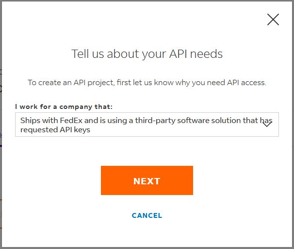 In the first selector window - choose the option “Ships with FedEx and is using a third-party software solution that has requested API keys.”: