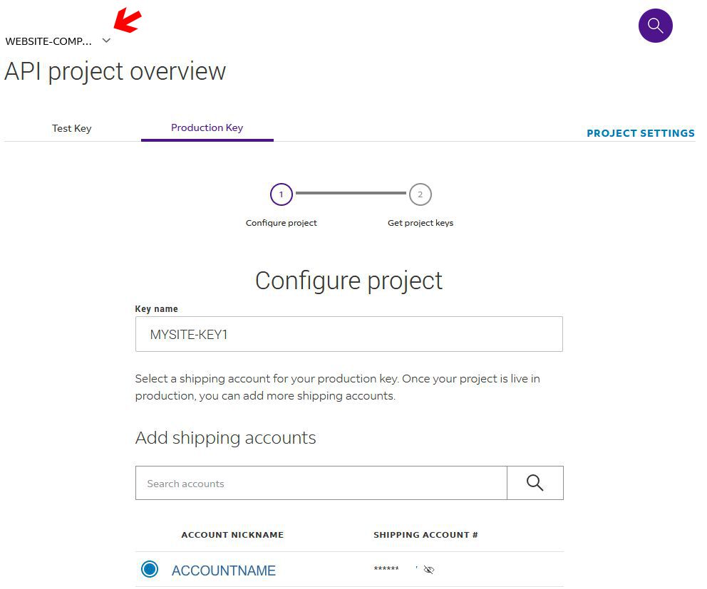 Select the PRODUCTION KEY (tab) near the top - ensure you are on the WEBSITE-COMPANY project you created earlier (it’s easy to miss, as show in this screen shot).
