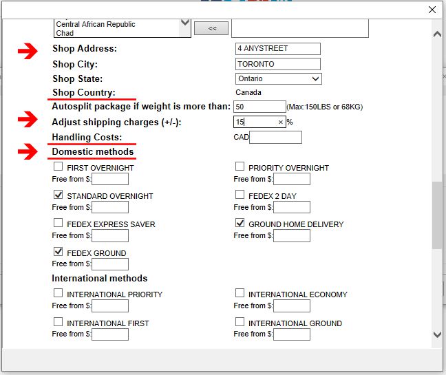 Continue down and enter your Shipping Address and review the additional items: Split Packages (check with FedEx for more information), Adjust Shipping Charges / handling costs if you require mark-up or Handling Cost coverage added on your displayed rates.